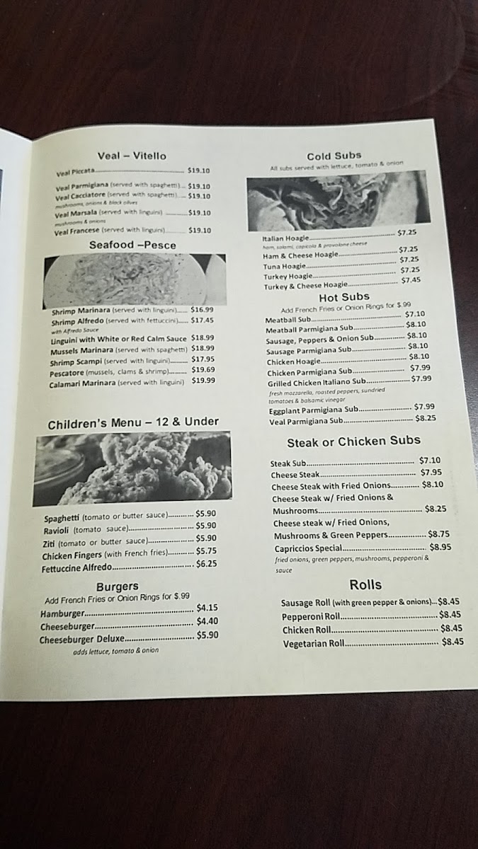 For pasta lovers, you can savor the classic dish of Pasta W/ Tomato Sauce, complete with your choice of spaghetti, penne, or rigatoni, along with a garden salad and freshly baked bread—making it only $16.62. Or elevate your dish with a luscious Meat Sauce for just a couple more dollars. Whatever your craving, Capriccios has something that will make you come back for more.